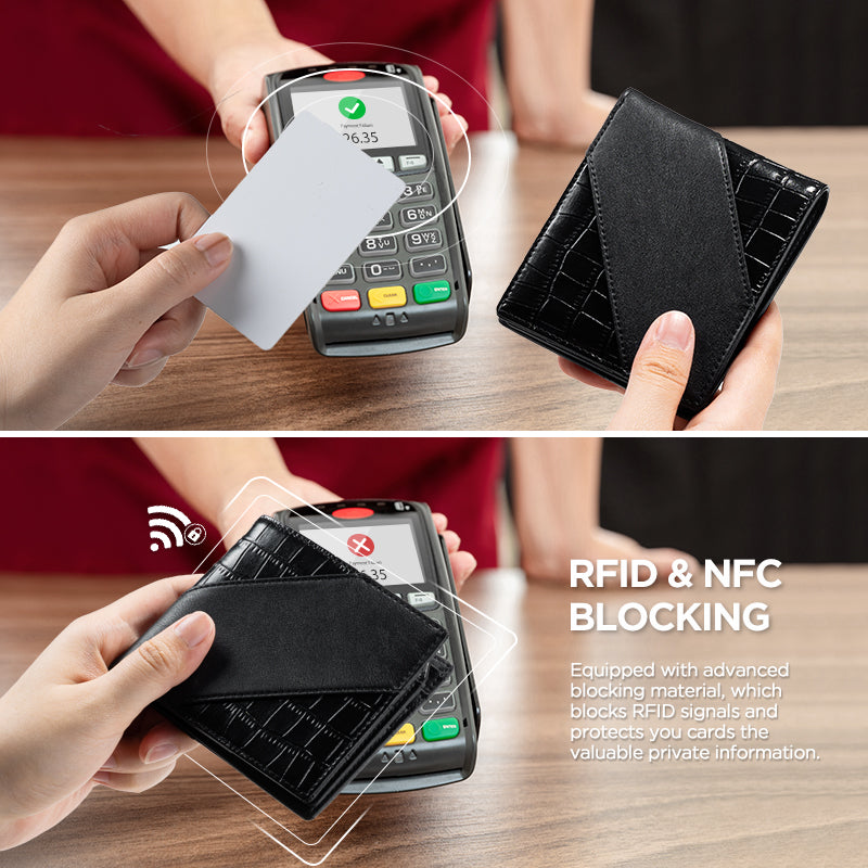 RFID wallet women are equipped with advanced RFID blocking technology.This slim wallet for women are enhanced with a protective layer to block RFID chip signals.