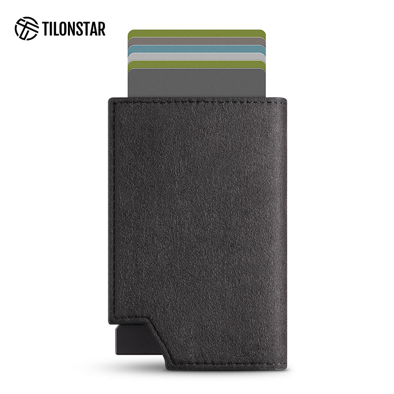 This bi-fold cardholder is made patented aluminum case and hand-crafted in Alcantara leather fabric. This RFID-blocking wallet protects your cards by blocking your card's electromagnetic signal.