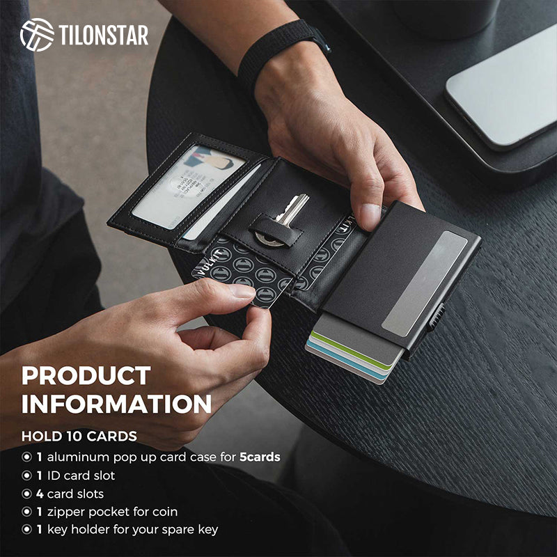 - Ample Storage Capacity - This TILONSTAR card holder stores 10 cards and some coins. The pop-up aluminum card holder stores 6-7, the built-in one key hole for your common spare key, and the ID window for driver's licenses.