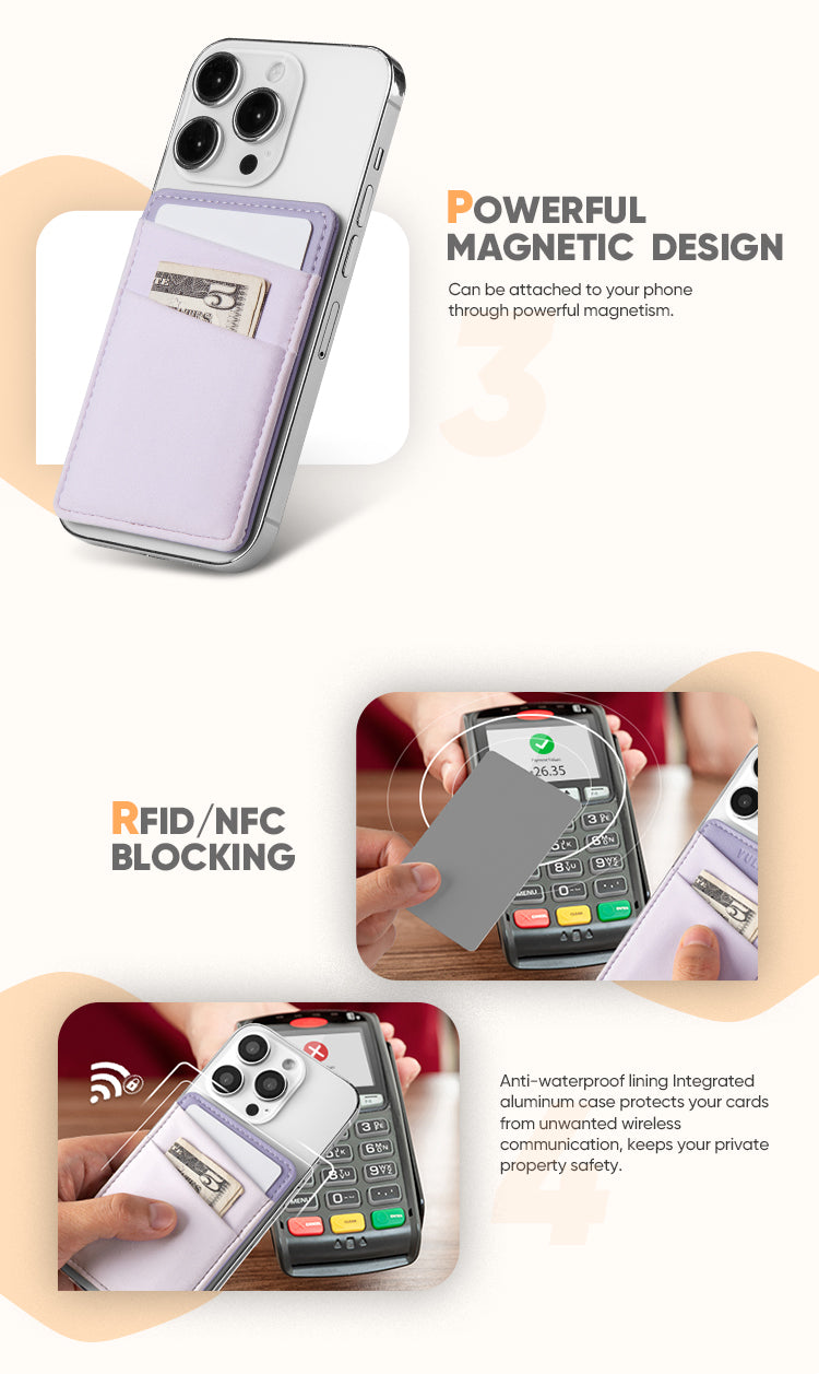 Easy Attached & Detached: The powerful magnet keeps the wallet tightly attached on your phone without dropping. Also, you can remove this wallet from your phone without trouble.